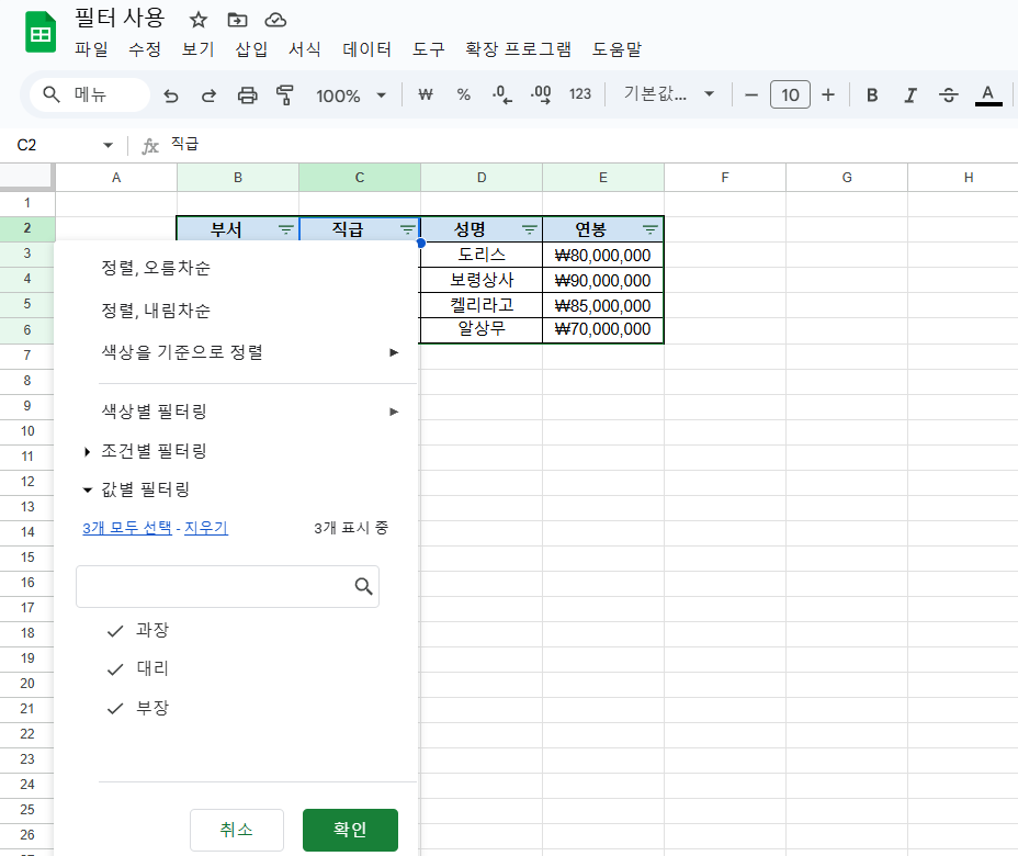 위 예제 표에서 한번 직급을 선택하여 성명과 연봉을 출력하는 명령어를 만들어본다면 아래와 같이 만들어볼 수 있겠습니다.