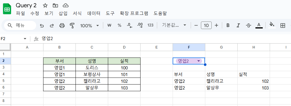 QUERY(B2:D6,"SELECT * WHERE Col1 = '영업1'")