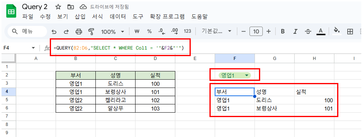 이제 F2 셀의 드롭박스를 이용해 값을 선택하면 QUERY 에서 변수화된 수식이 F2 셀의 값을 참조하여 Where 절의 Col1과 비교하여 결과를 가져옵니다.
