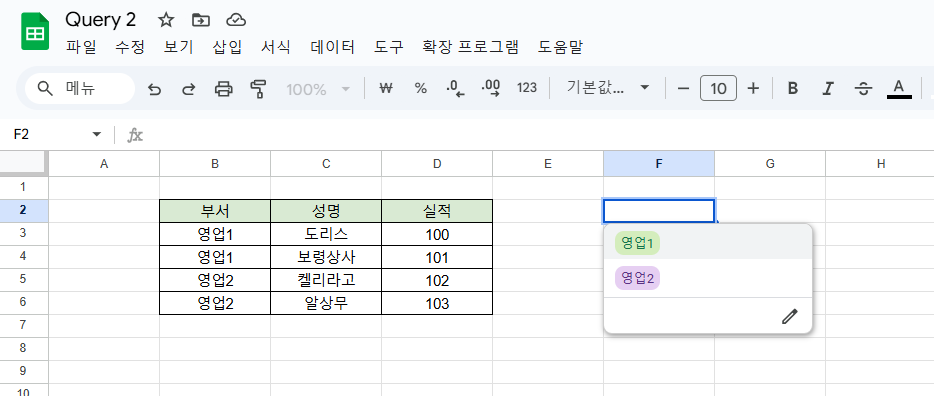이제 지난 포스팅에서 배운대로 F2셀 밑에 Query 문을 이용해 영업1 부서의 트랜잭션을 참조하는 수식을 만들어 보도록 하겠습니다.
