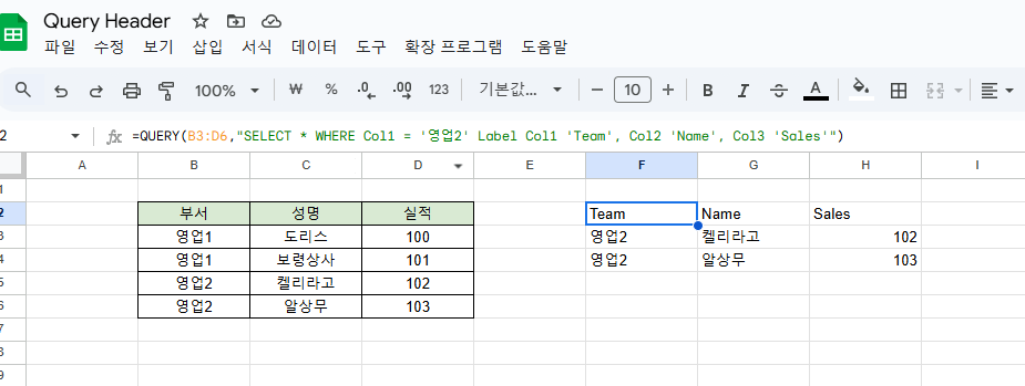 QUERY(B3:D6,"SELECT * WHERE Col1 = '영업2' Label Col1 'Team', Col2 'Name', Col3 'Sales'")